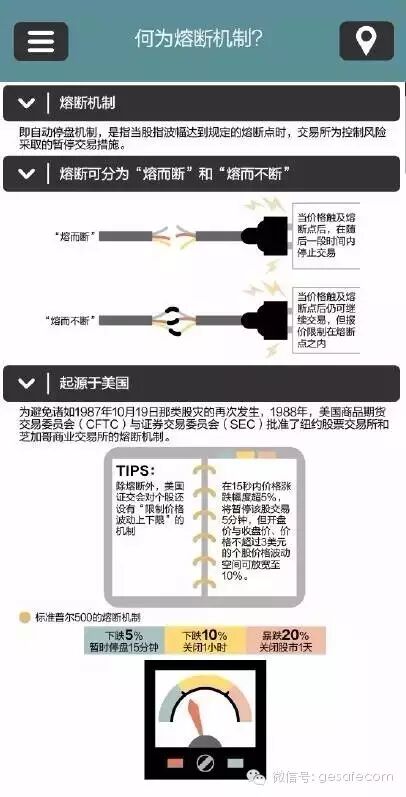 这个诞生于美国资本市场的交易机制,在6.15股灾后被国内业内人士千呼万唤。熔断机制的设立旨在避免发生“闪电暴跌”事件。(也可以是暴涨)在交易过程中,当价格波动幅度达到某一限定目标时,交易将暂停一段时间,类似于保险丝在过量电流通过时会熔断以保护电器不受到损伤。